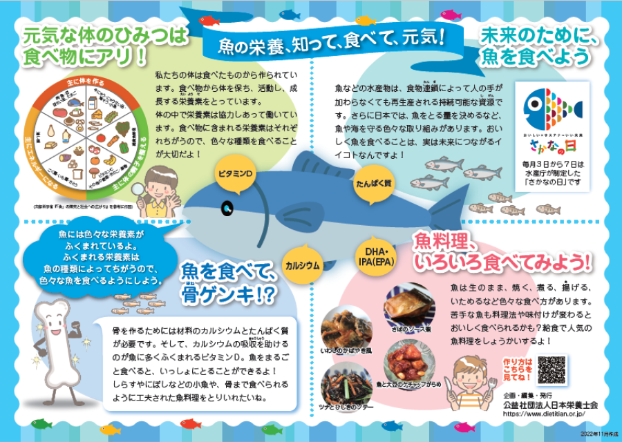 水産庁は「さかな×サステナ」をコンセプトに毎月3日から7日を『さかなの日』と制定。日本栄養士会では、2022年「栄養の日・栄養週間」において『栄養と環境』をテーマに活動を推進してきたことから、本活動に賛同し、魚食普及を目指した子ども向けの資料をまとめました。