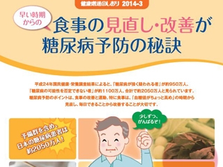 平成24(2012)年国民健康・栄養調査によると、「糖尿病が強く疑われる者」は約950万人、「糖尿病の可能性を否定できない者」は約1100万人、合計で約2050万人と見られています。初期の頃は自覚症状がありませんが、放っておくとさまざまな合併症やがんのリスクを上昇させてしまいます。糖尿病予防のポイントは、食事の改善と運動。特に食事は、「血糖値がちょっと高め」の時期から見直し、毎日できることから改善することが大切です。