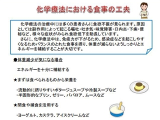 化学療法の副作用による食欲不振、味覚障害、口内炎の食事の工夫と、栄養補助食品などの使用について紹介しています。
