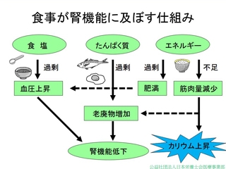 食事が腎機能に及ぼす仕組み、ステージ別食事療法、CKDの進行過程と栄養基準などを図解でわかりやすく紹介しています。
