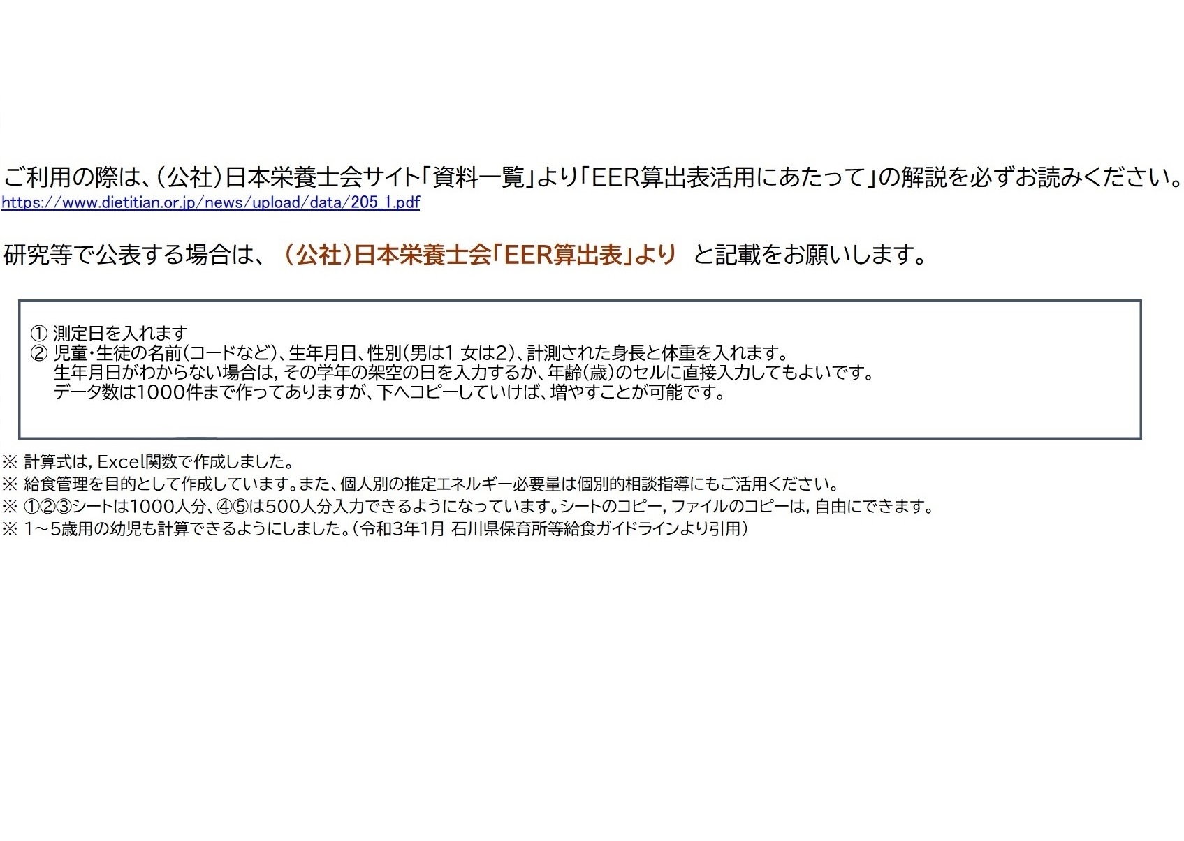 まずはこちらから、「EER算出表活用にあたって」「学校給食摂取基準の活用」をダウンロードし理解したうえでご活用ください。