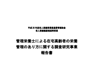 管理栄養士による居宅療養管理指導の実態調査、在宅高齢者の栄養管理体制調査結果を踏まえ、在宅高齢者の摂食状況・栄養状況把握方法と栄養食事指導方法、地域連携方法の提案をまとめて報告しています。