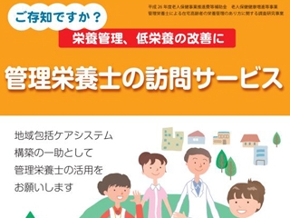 地域包括ケアシステムにおける管理栄養士の訪問サービスについて、介護保険事業者、医療関係者、地域行政関係者にご理解いただくためのリーフレットです。