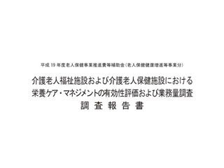全国の介護保険施設における、介護の状況、食事の状況に関する調査を踏まえ、栄養ケア・マネジメントの実態を把握するとともに、利用者の予後における栄養マネジメントの関連を明らかにすることを目的として、多施設共同による大規模コホート研究を実施した報告書です。