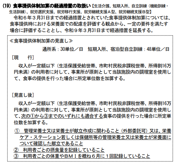 収入が一定額以下の利用者に対して、事業原則として当該施設内の調理室を使用して、食事の提供を行った場合に所定単位数を加算するという現行の要件に加え、①管理栄養士等が献立作成に関与または献立の確認を行い、②利用者ごとの摂食量の記録、③利用者ごとの体重の記録を行った場合に、所定単位数を加算することとなりました。