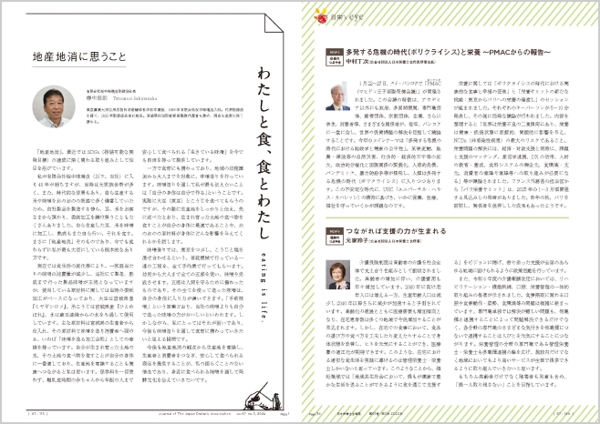 「日本栄養士会雑誌」は毎月1日に発行しています。時宜に合ったテーマの特集、各界著名人からのメッセージ、現場を重視した事例報告、各分野の管理栄養士・栄養士を紹介するコンテンツなど、栄養・健康に関する情報が満載です。