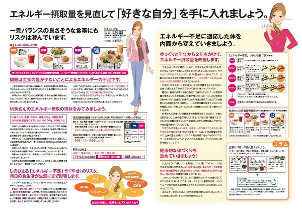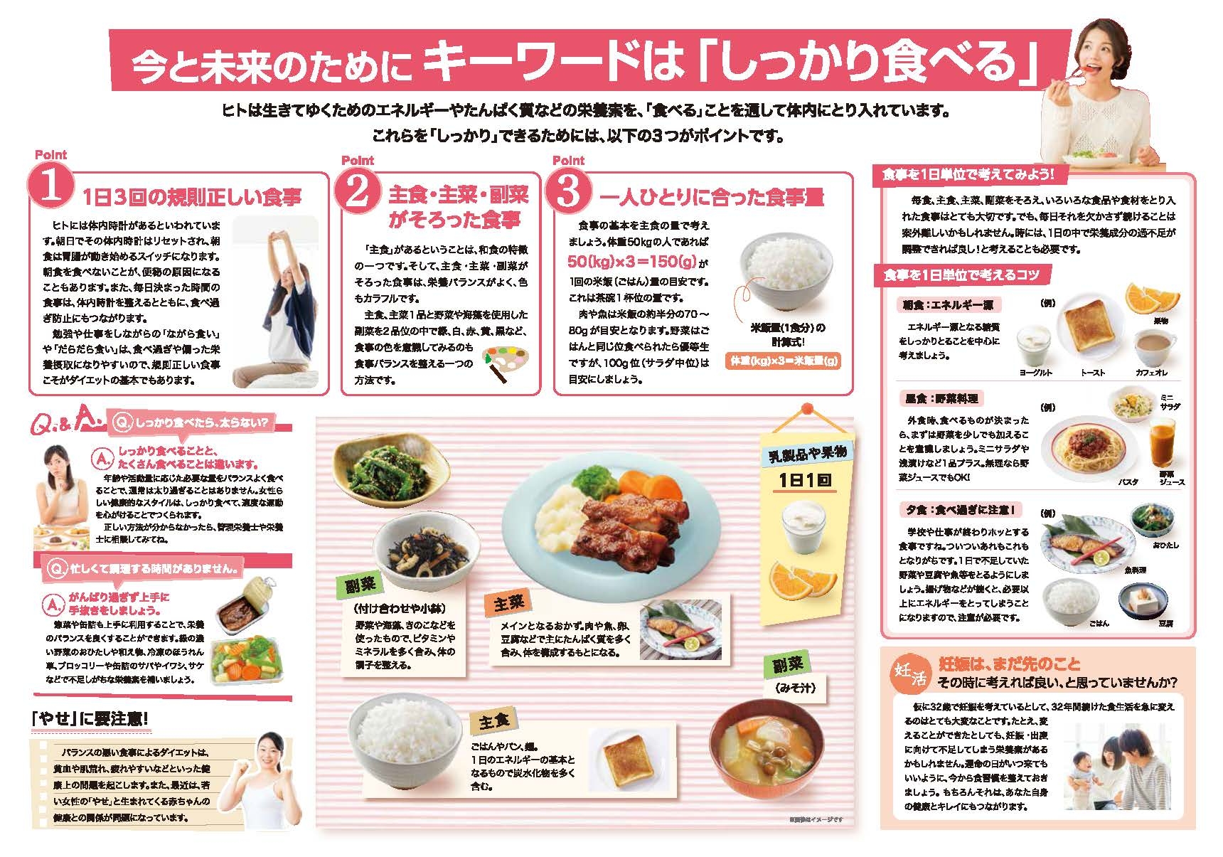 厚生労働省が発表した国民健康・栄養調査(平成25年度)において、20歳代女性のやせの問題が指摘されています。女性のやせの問題は、自身の健康だけでなく、未来の子どもたちへも続いていきます。中学生から成人女性まで、幅広い年代の女性を対象に、しっかり食べることの大切さと食事のポイントをわかりやすくまとめました。