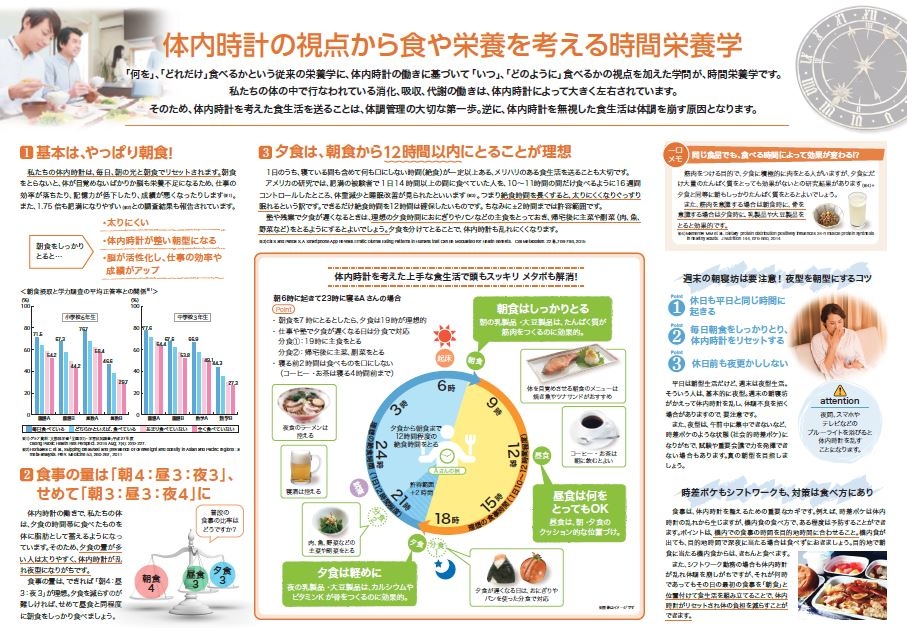 朝が苦手、午前中は集中できない、メタボが気になってきた、よく眠れないなどの体調不良は、食べる時間に問題があるのかもしれません。今回は時間栄養学の考え方を取り入れた食生活のポイントを紹介する内容となっています。食べる時間見直して、頭スッキリ、メタボ解消を目指してみてはいかがでしょうか。