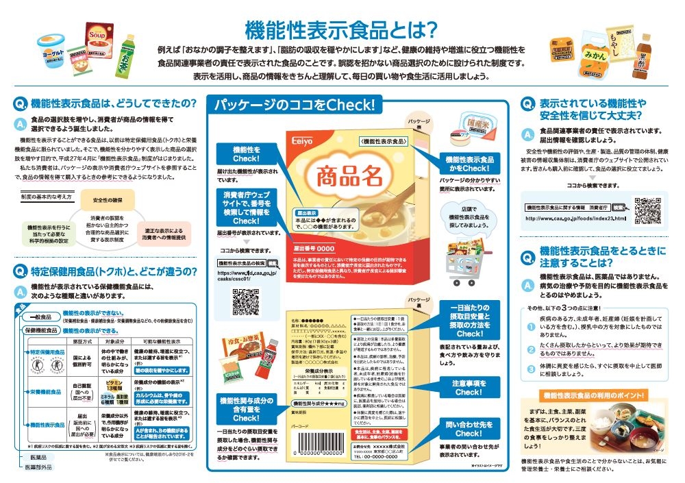 「おなかの調子を整えます」、「脂肪の吸収を穏やかにします」など、健康の維持や増進に役立つ機能性を、食品関連事業者の責任で表示された食品のことを機能性表示食品といいます。このしおりでは、機能性表示食品とはどのような食品なのか、注意点などをわかりやすくまとめました。商品のパッケージに表示された情報を正しく理解して、毎日の買い物や食生活に活用しましょう。