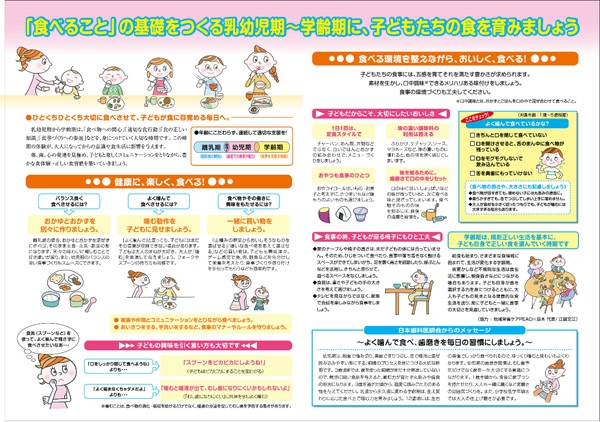 子どもは、乳児期・幼児期と成長するに従い、「飲む、噛む、食べる」などの機能を育んでいきます。そして、学齢期は正しい食の選択力を身に付け、習慣付ける大切な時期です。乳幼児期から学齢期にしっかりと噛んで味わい、正しい食習慣を身に付けることが心身の健康につながります。また、この時期の体験が大人になってからの意識や食生活に影響を与えます。