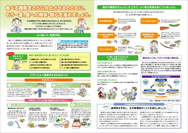 バランスの良い食事を選び、よく噛んで適切な量を食べることは、メタボリックシンドロームなどを予防する上でも大切です。食べる機能を維持するために、成人の食べる力をサポートしましょう。