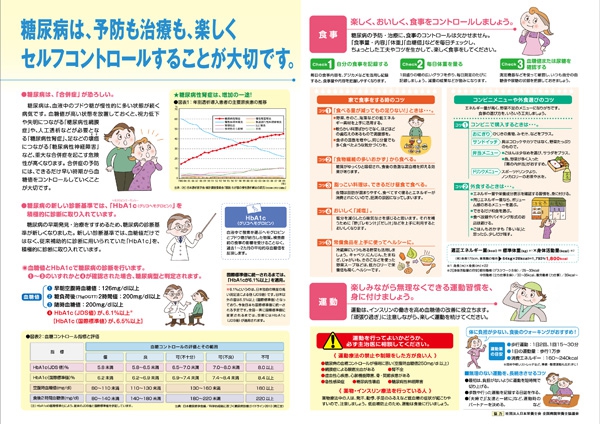糖尿病の予防や治療は、食事のコントロールと運動が基本です。「何をどれだけ食べているか」「無理のない運動を続けているか」などをチェックしながら、積極的に生活改善をしていきましょう。