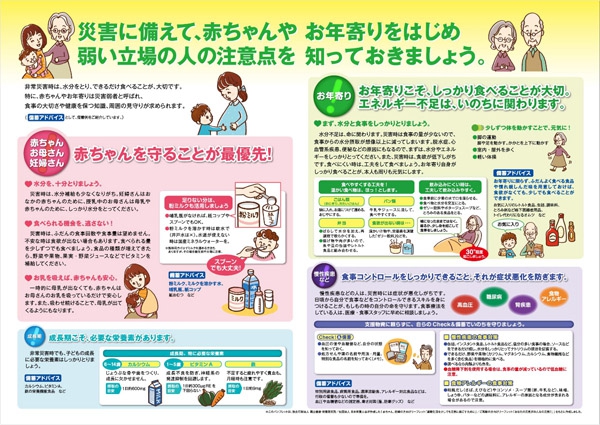 地震などの災害時、非常に弱い立場になるのが赤ちゃんやお年寄り、そして、慢性疾患などの患者さんたちです。また、成長期の子どもたちも、必要な栄養素が不足がちになります。特に赤ちゃんやお年寄りは災害弱者と呼ばれ、食事の大切さや健康を保つ知識、周囲の見守りが求められます。