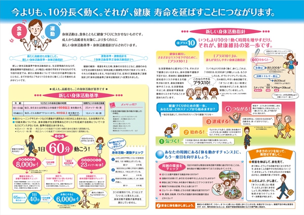 ふだんの生活で無理なく身体を動かすことで、生活習慣病、運動器障害や認知症などを予防し、「健康寿命」を延ばすことにつながります。今よりも、10分長く動く、それが、健康づくりのポイントです。