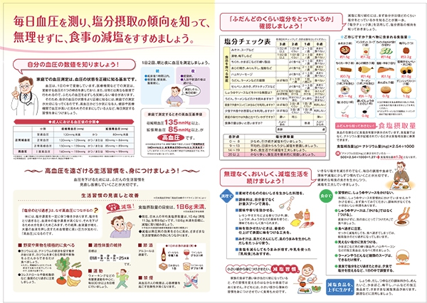 ふだんから自分の血圧の数値や塩分摂取の傾向を知り、無理せずに、減塩を続けられる食事などについて、知っておきましょう。